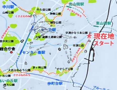 「せきれいのみち」を進み、早渕公園、せせらぎ公園、茅ヶ崎公園で外れて、センター南駅に戻ります。