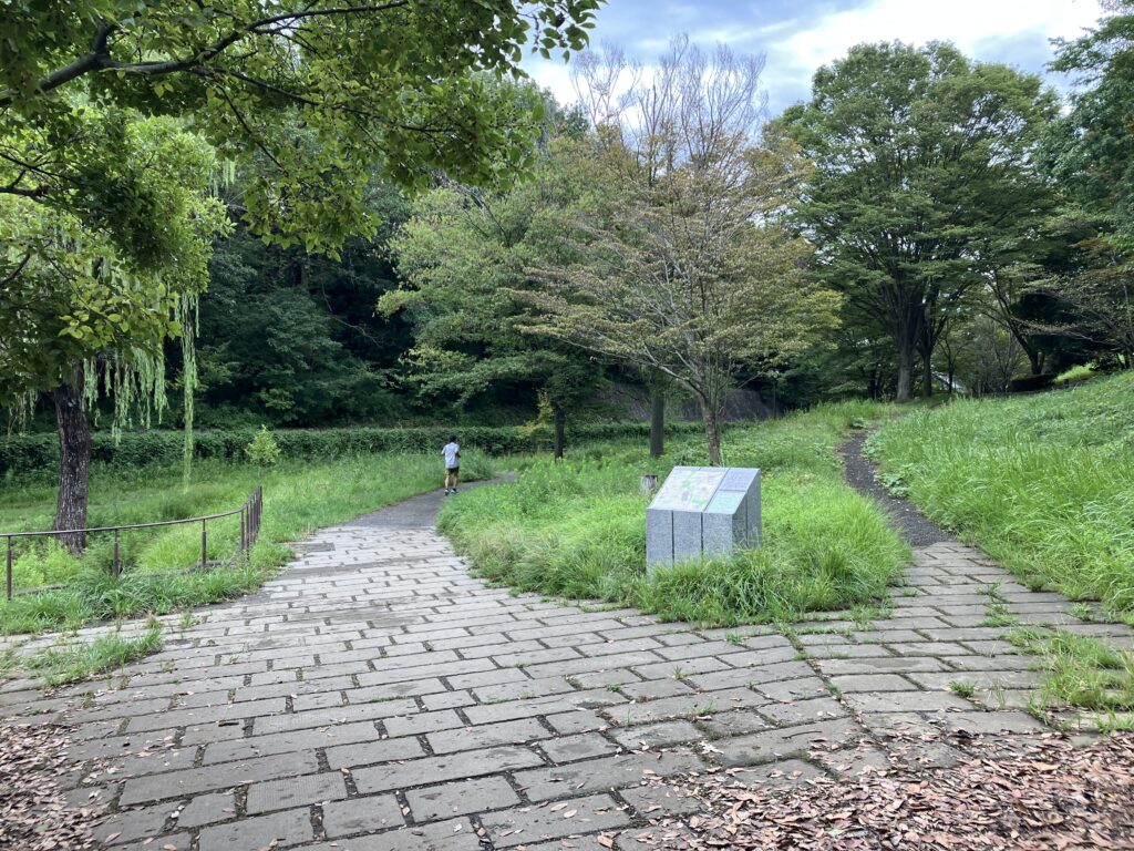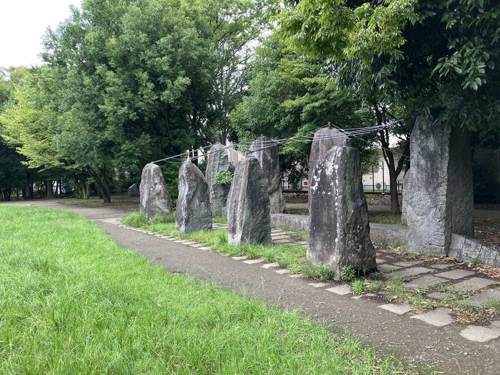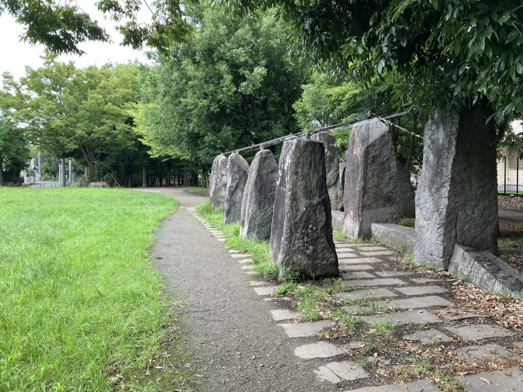 大原みねみち公園を抜けて、葛ヶ谷公園に入りました。広い略地のそばに石のモニュメントのようなものがありました。