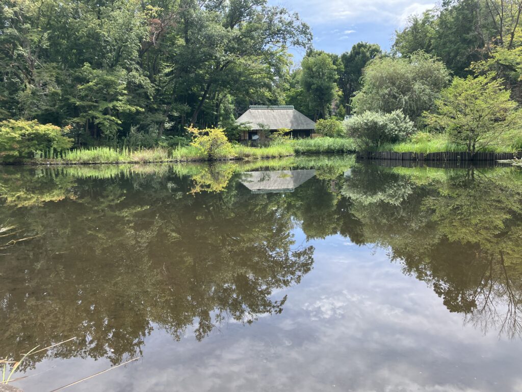 せせらぎ公園に入りました。池の向こうに古民家が見えます。