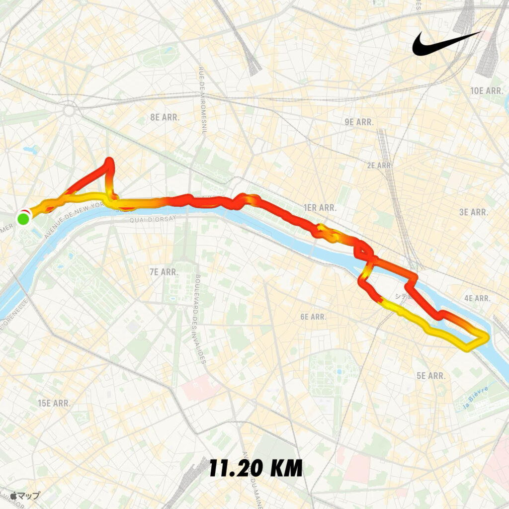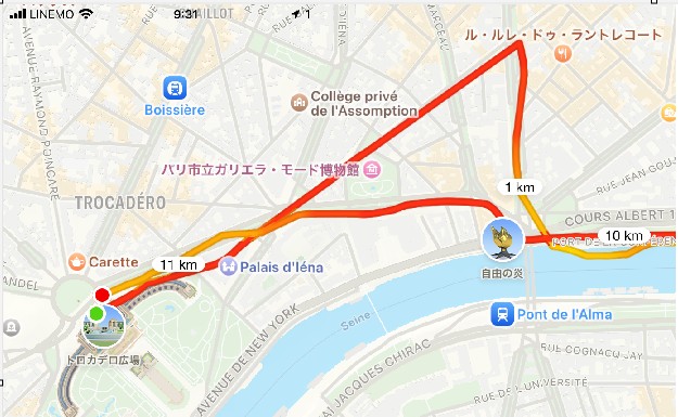 実は最初コースを間違えて、セーヌ川と逆の方へ行ってしまいました。その後、iPhoneで確認して、正しいコースへ戻っています。