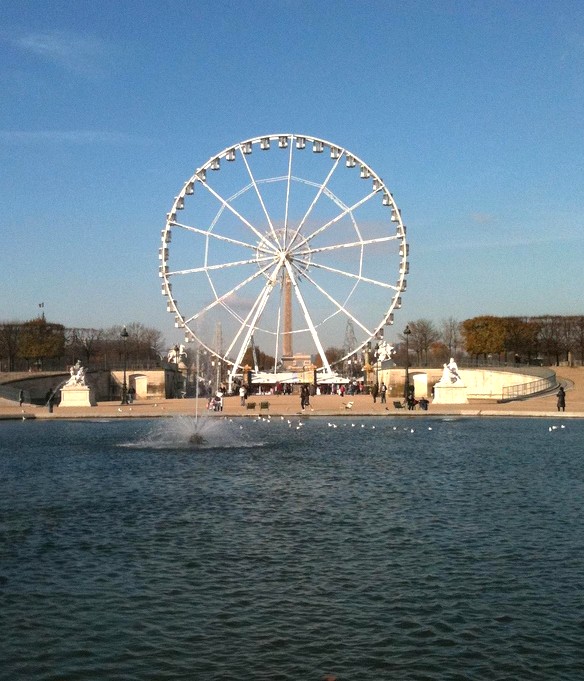 セーヌ川を走って、しばらくするとコンコルド広場が見えてきます。コンコルド広場の先には、チュイルリー公園の観覧車が見えます。2010年の11月には、観覧車がありましたが、現在では期間限定で観覧車が設置されているそうです。数か月利用するために観覧車を設置するという発想はどこから出てくるのかわかりません。そんなに簡単に設置・撤去できるものなのでしょうか?